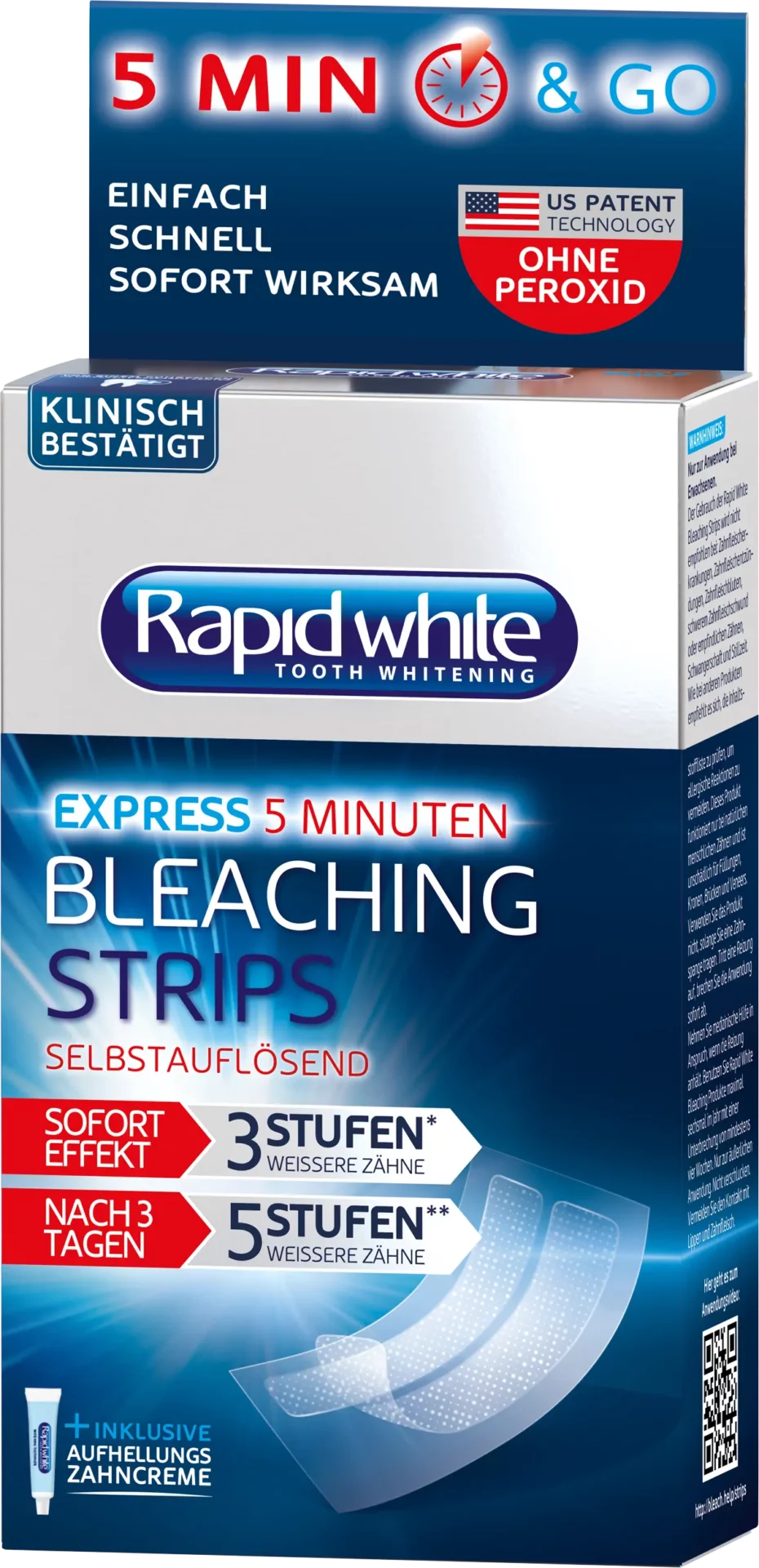 Rapid White bietet mit seiner selbstauflösenden Strip-Technologie eine schnelle und wirksame Aufhellungsmethode – ganz ohne Wasserstoffperoxid.