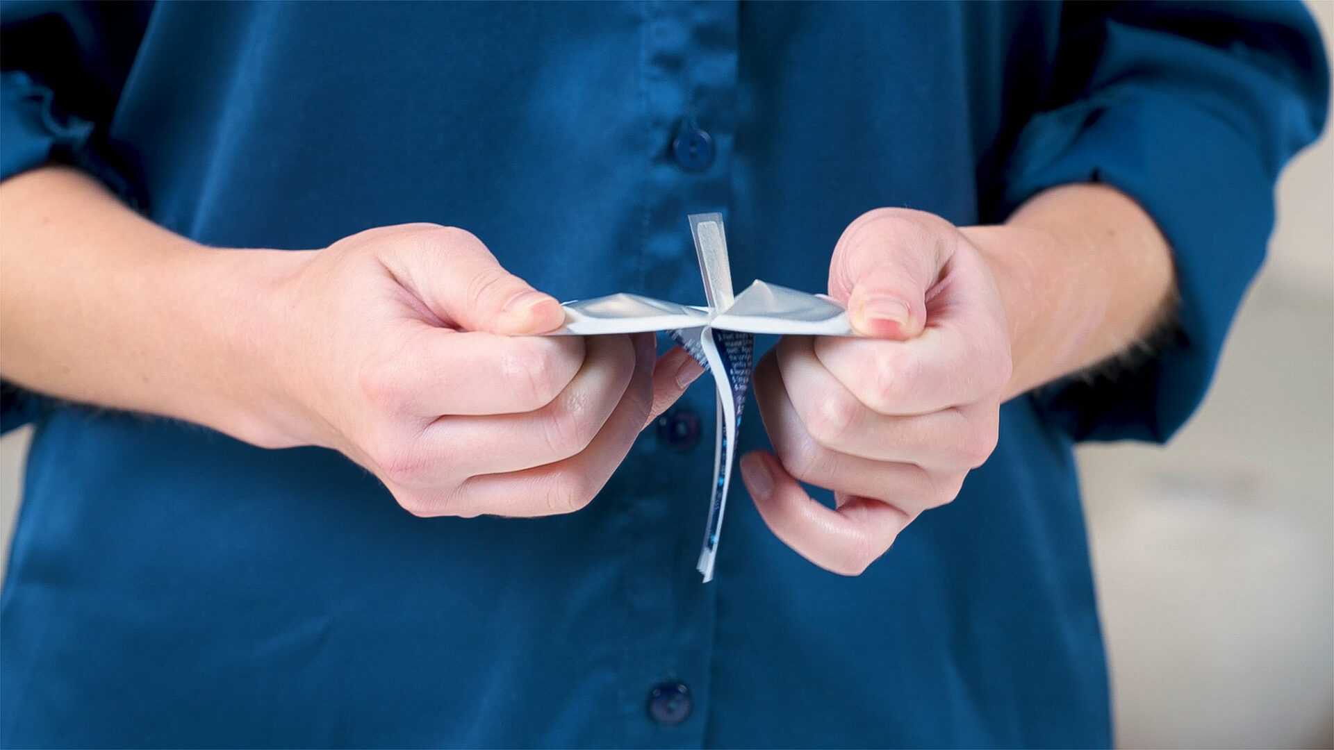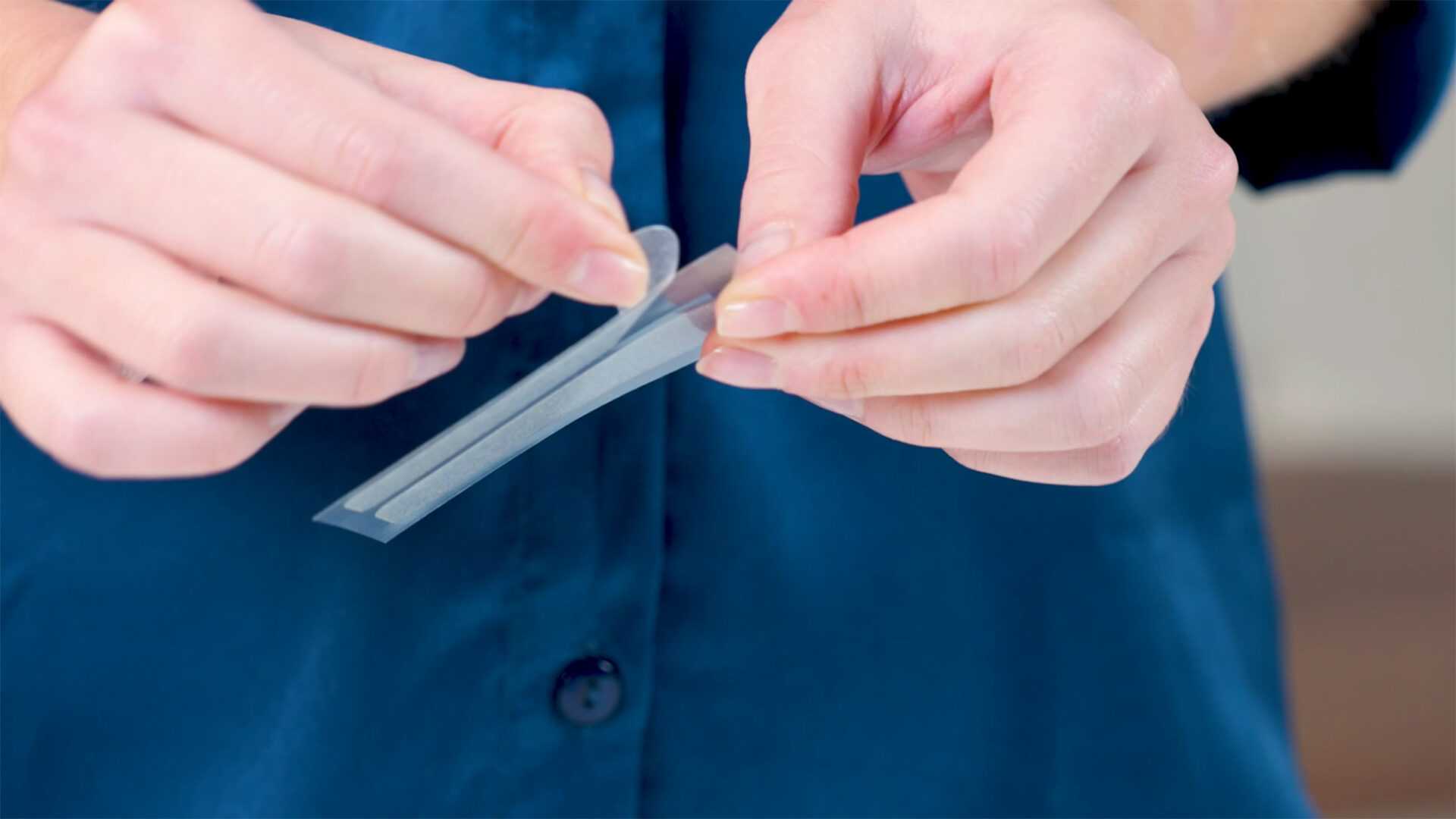 Löse den ersten Strip vorsichtig von der transparenten Folie. Beachte, dass die Seite, die auf der Trägerfolie klebt, auch die Seite ist, die auf die Zähne aufgetragen wird.